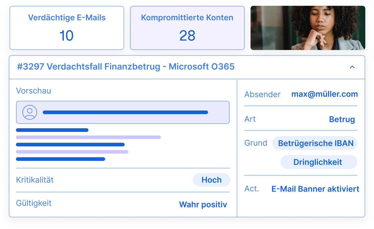 Prüfung eingehender E-Mails auf Finanzbetrug und E-Mail-Kompromittierung. KI-gestützt und vom Stoïk SOC überwacht.